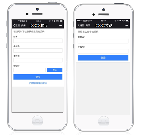 步骤一: 首先,用户进入报名页面,输入姓名,身份证号,手机及动态验证码即可报名。报名后会获得一个抽奖码。(注:手机号和身份证号对应只能报名一次)