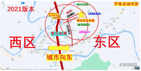 从怀集的卫星地图中,将县城划一条中轴线。西区得于最早10年的发展,发展较为成熟,但看地图的道路分布图,密密麻麻的街道,注定 西区发展早已成定局,可塑性空间不大。