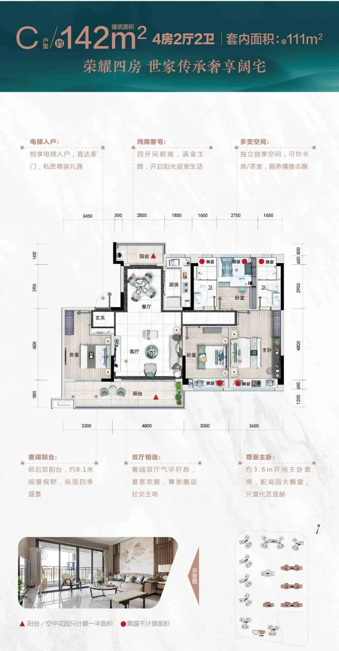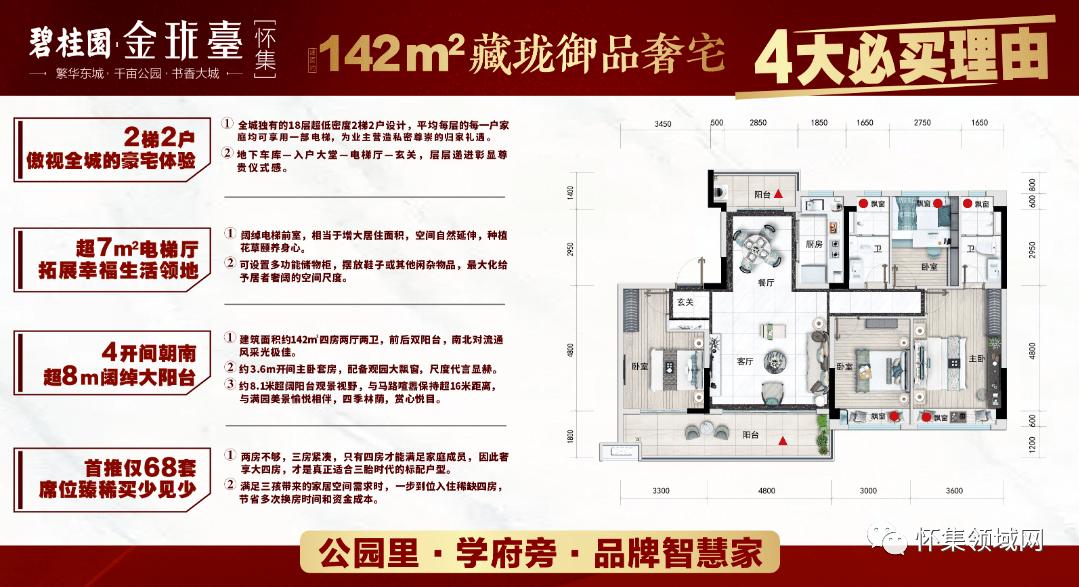拥有豪宅标准的专梯专户142㎡四房,产品上按照碧桂园集团最新的装修标准进行交付,搭配 中国物业服务三强碧桂园服务, 24小时的管家式服务,打造 未来怀集人居标杆。