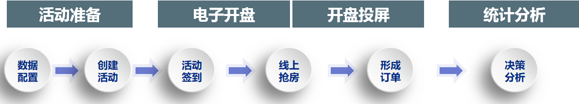 开盘前,进行房产信息和客户信息的导入和配置,同时建立活动和活动批次,将楼盘信息、潜在客户信息与活动关联,并进行销控管理,从而建立开盘活动。