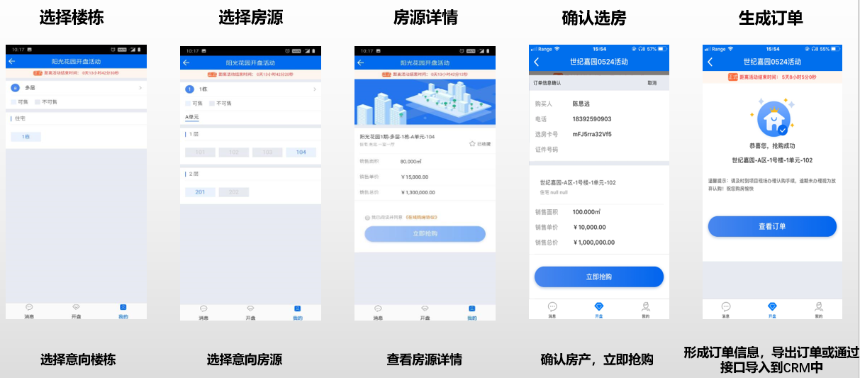 建立从签到、抢房到订单的电子开盘全链条管理,实现开盘工作的精细化、共享化、规范化的管理过程。包括APP端和微信端。